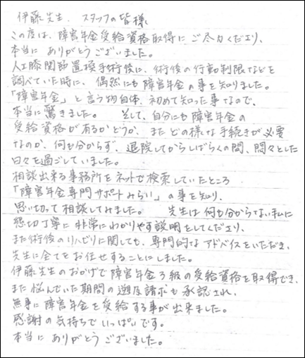 この度は、障害年金受給資格取得にご尽力くださり、